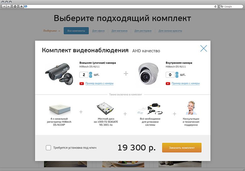Изучаем аналитику по переделанному сайту и понимаем, что продажа «готовых комплектов видеонаблюдения» — это отдельная единица спроса. Принимаем вместе с заказчиком решение выделить продажу комплектов в отдельный сайт.