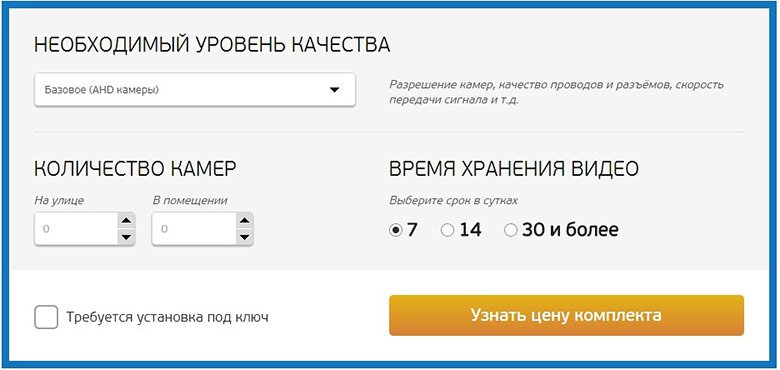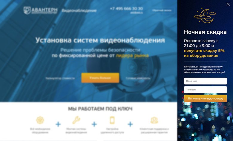 С сайта по «видеонаблюдению под ключ», в свою очередь, убираем всё про комплекты и цены в принципе. Оставляем только конфигуратор для расчёта стоимости проекта. Также добавляем фишечку «ночная скидка», которую можно получить в период с 10 вечера до 9 утра.