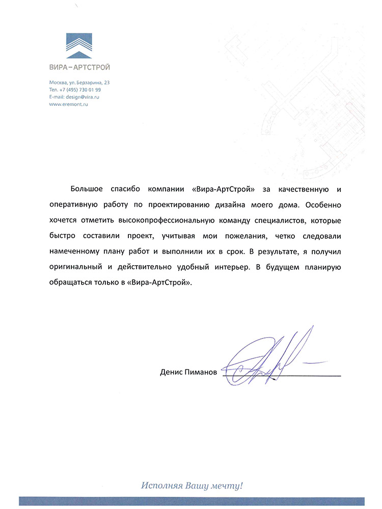 Особенно хочется отметить высокопрофессиональную команду специалистов, которые быстро составили проект, учитывая мои пожелания, четко следовали намеченному плану работ и выполнили их в срок. В результате, я получил оригинальный и действительно удобный интерьер. В будущем планирую обращаться только в «Вира-АртСтрой».