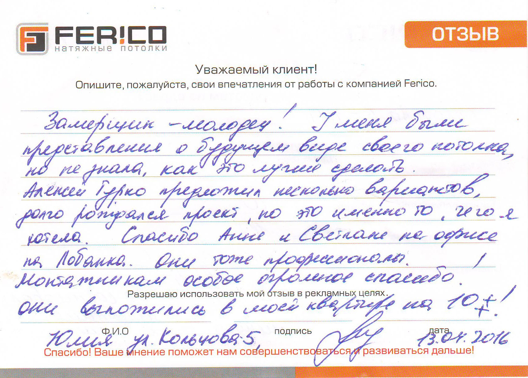 Если вы хотите и готовы снять свой видеоотзыв, то мы можем выслать к вам бригаду видеооператоров и вы почувствуете себя настоящей звездой телеэкрана. Дополнительно, в качестве благодарности, после съёмки видеоролика, мы сделаем вам ценный подарок и наградим сертификатом на сумму до 10'000 рублей.