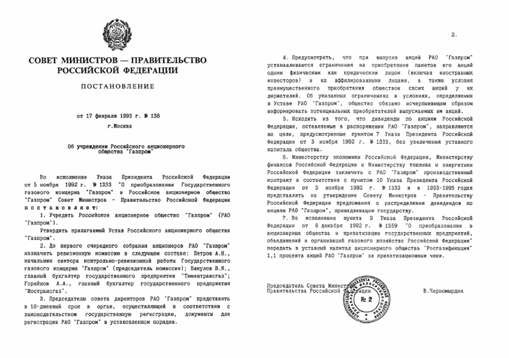Министерство газовой промышленности СССР преобразовано в Государственный газовый концерн «Газпром». 5 ноября подписан указ президента Российской Федерации «О преобразовании ГГК «Газпром» в Российское акционерное общество «Газпром»». 17 февраля 1993 года выходит соответствующее постановление правительства Российской Федерации.
